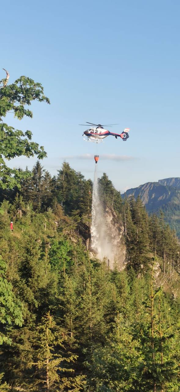 Ausgangspunkt LP ist in Hohenems Schuttannen. Egg übernimmt den oberen Landeplatz für Wucher 1. Einweisen HS über Funk, Material für Flüge in Kisten herrichten, Wasserbehälter 400l befüllt. 6 Transportflüge zum Einsatzort wurden von Wucher 1 durchgeführt.