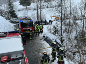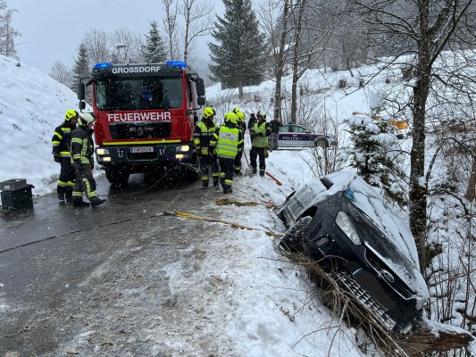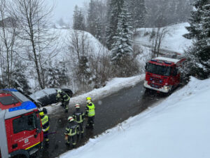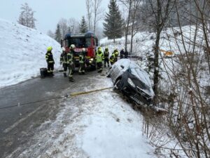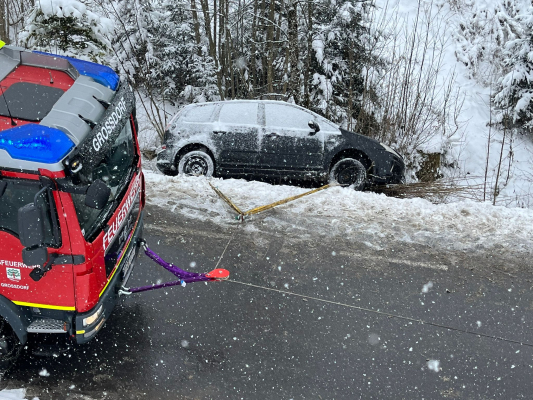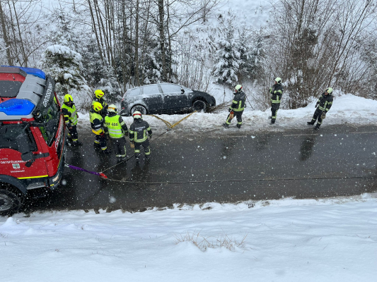 PKW seitlich über Böschung. Bergung mittels SRF und LFB FW Grossdorf. Mit Seilwinde, Umlenkrolle und Greifzug wieder auf die Straße gestellt. Winterdienst hat noch die Straße geräumt.