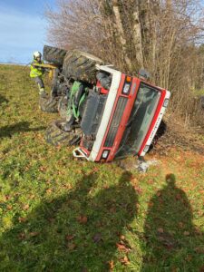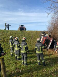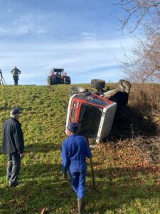 Fahrzeugsicherung, Gestrüpp entfernen, Fahrzeug mit Hilfe von SRF-Kran und Traktor aufgerichtet und an Straße gezogen, Unfallstelle aufgeräumt.