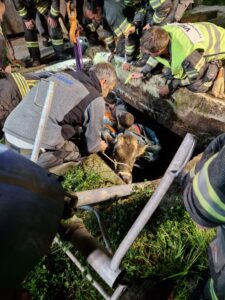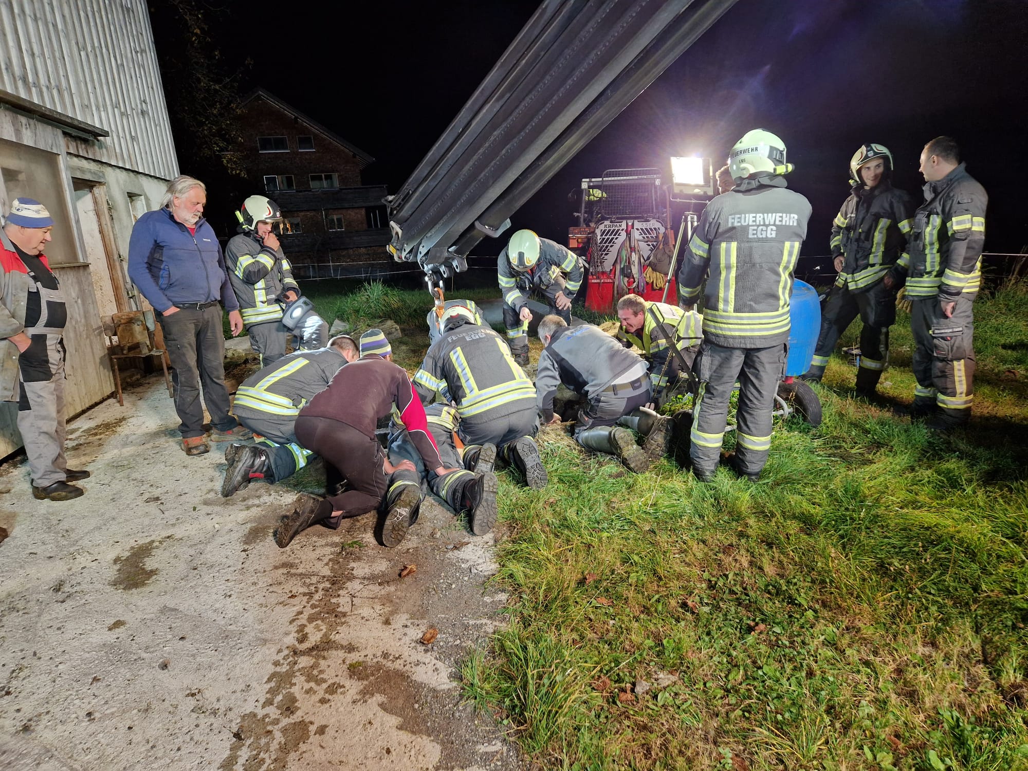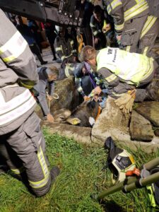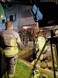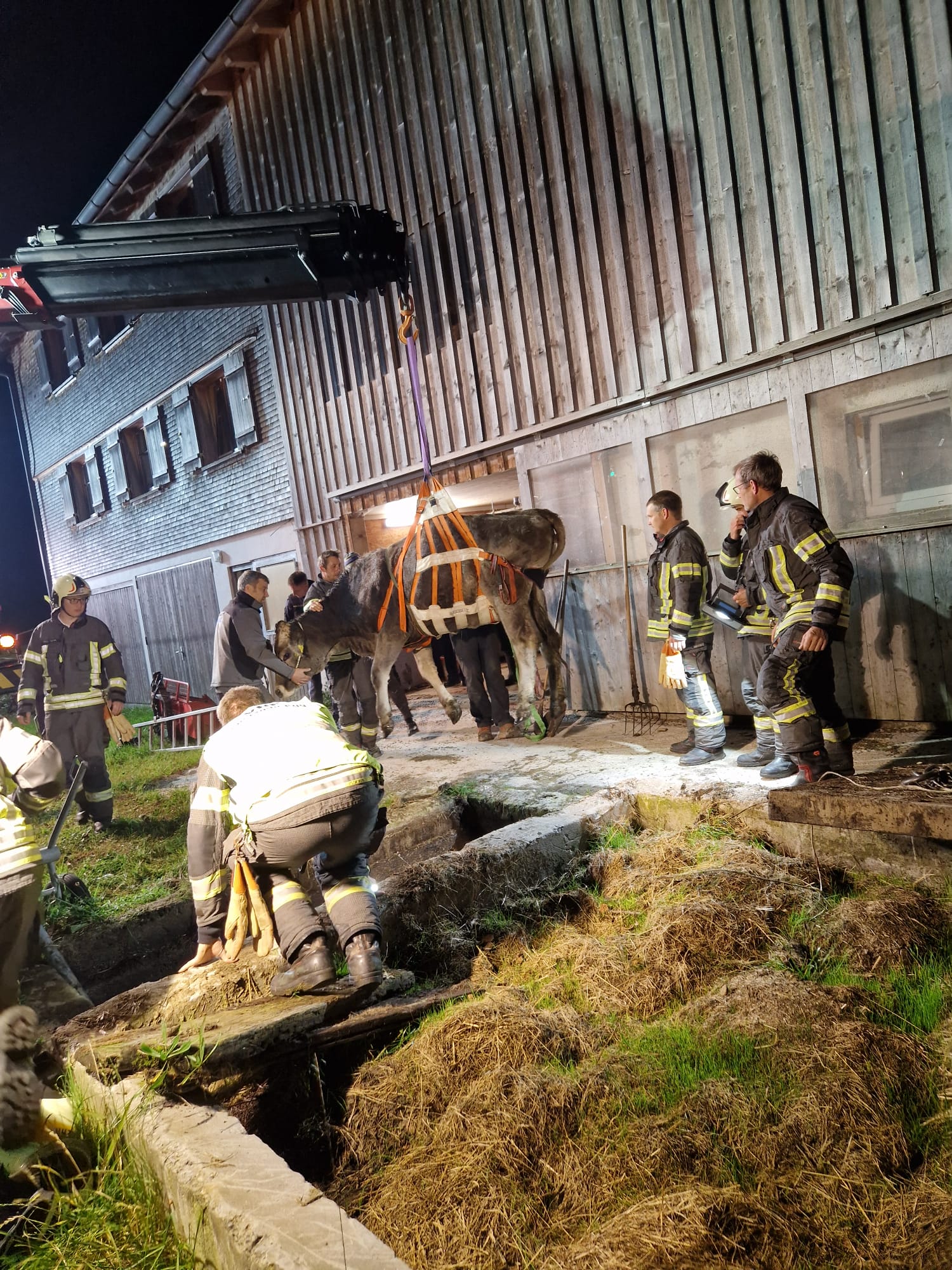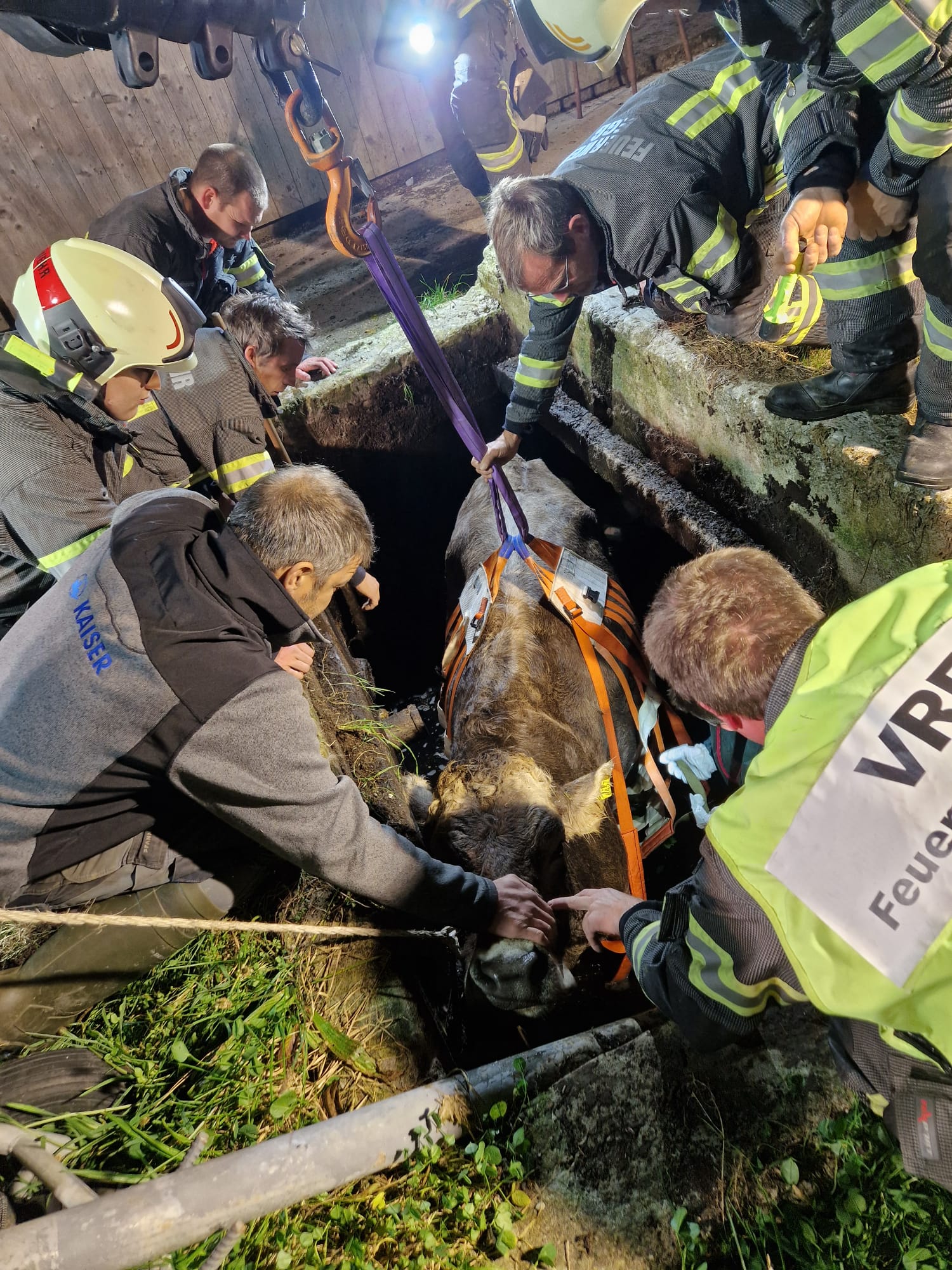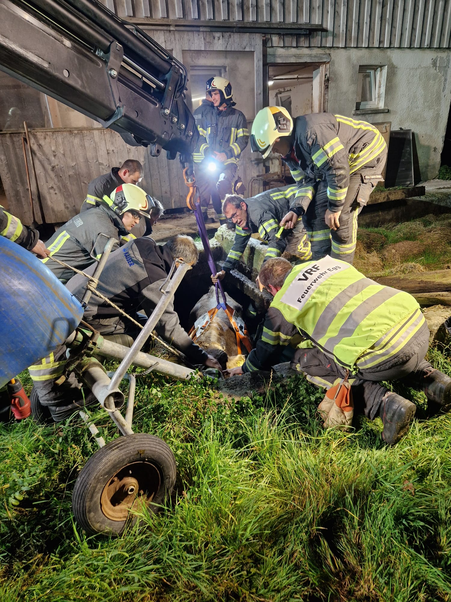 Rind mit Tierrettungsset und Kran aus Güllegrube gerettet. Einsatzstelle an Besitzerin übergeben.