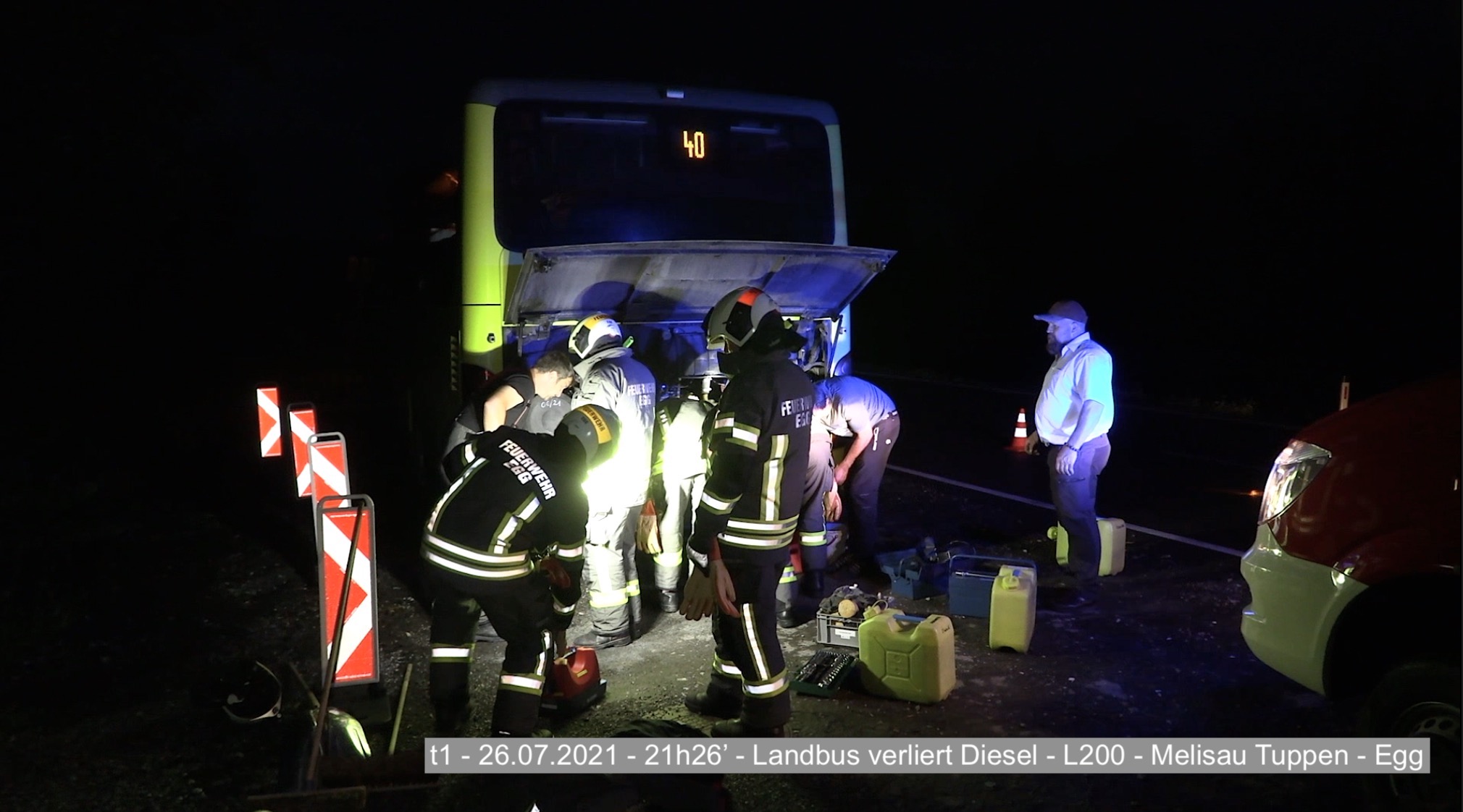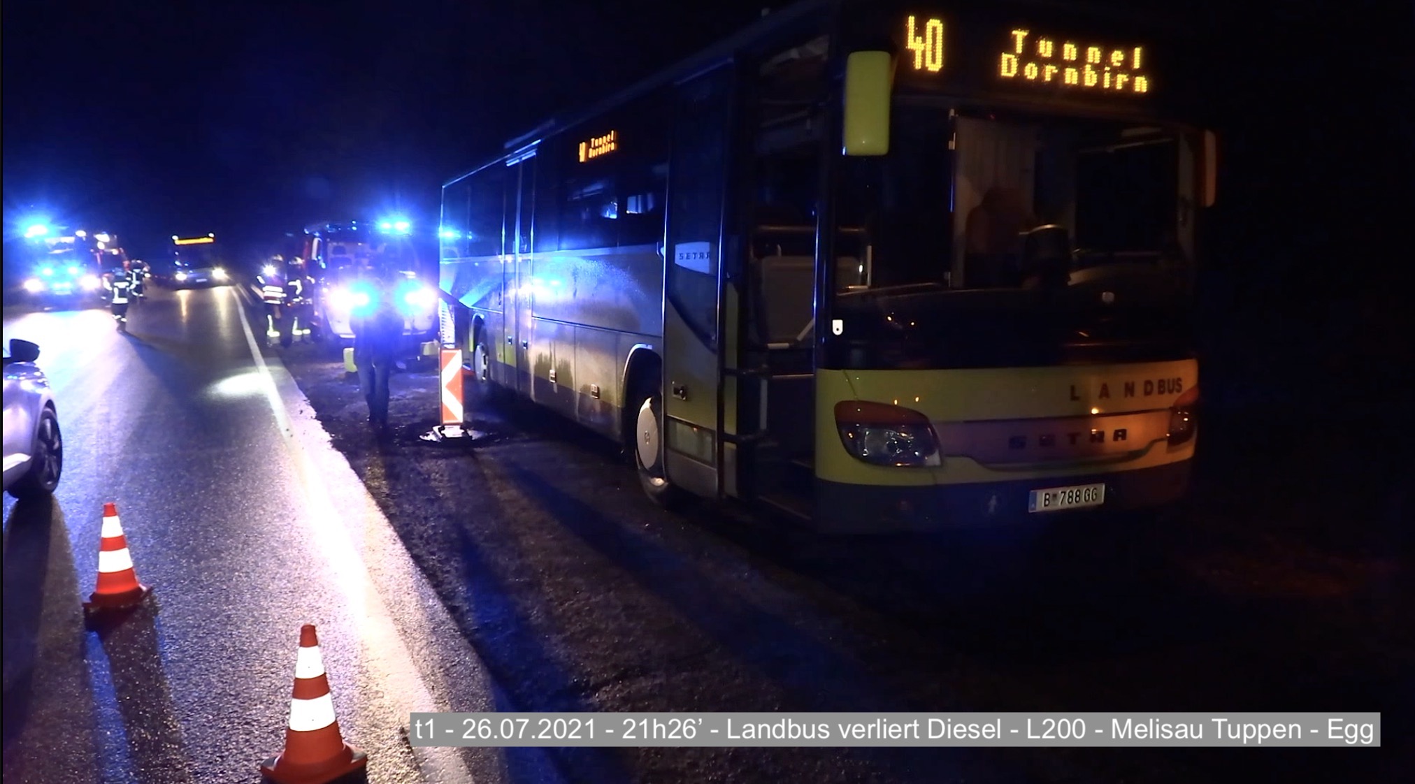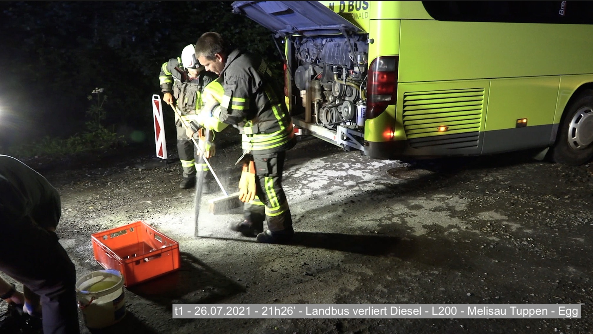 2 Einatzstelle L200 Müselbach > beim Parkplatz nach der dreispurigen Bus hat Diesel verloren, Leck wurde mit Pfropfen abgedichtet, Diesel binden mit Bindemittel. Verkehrsregelung L200.
