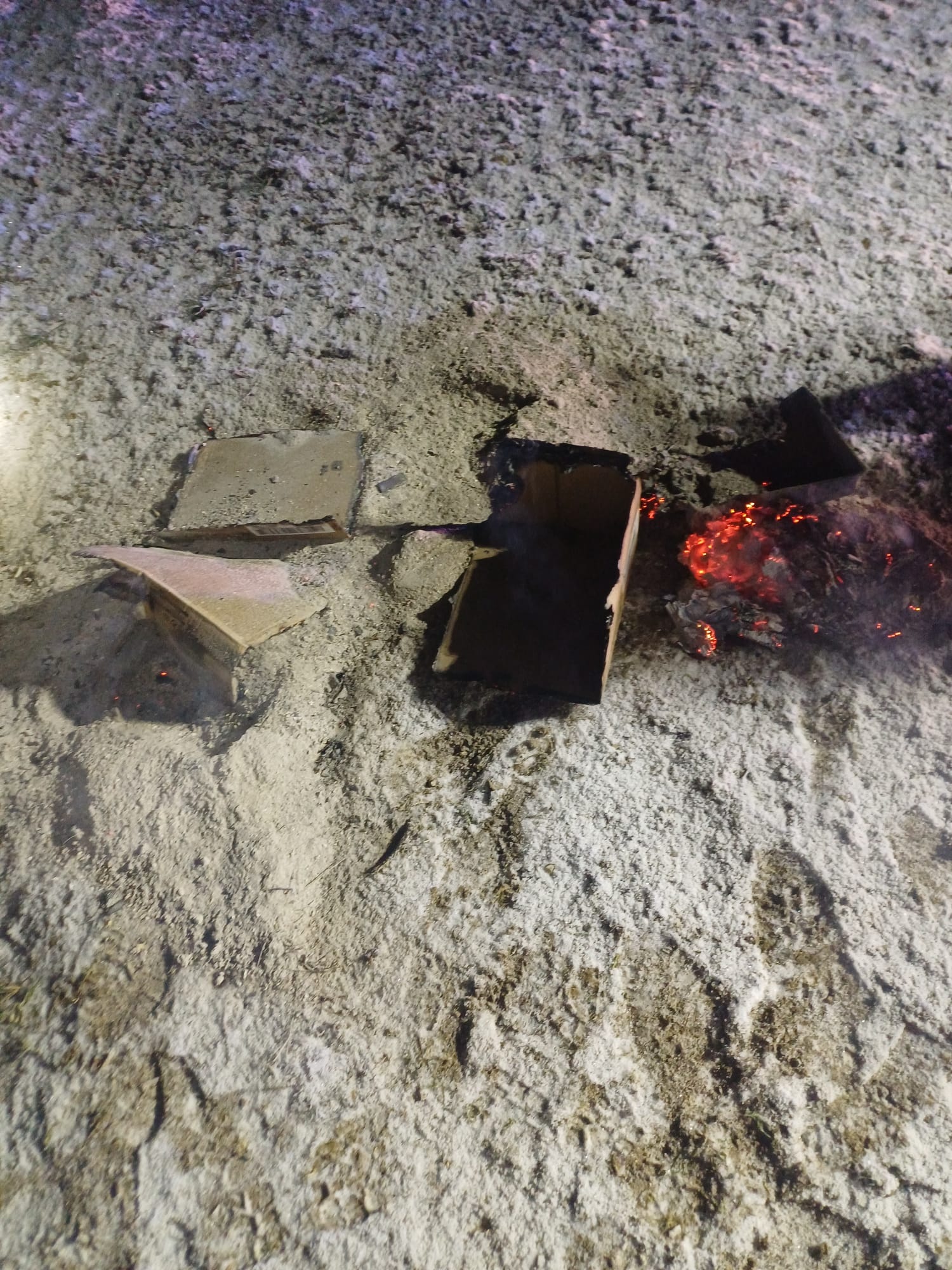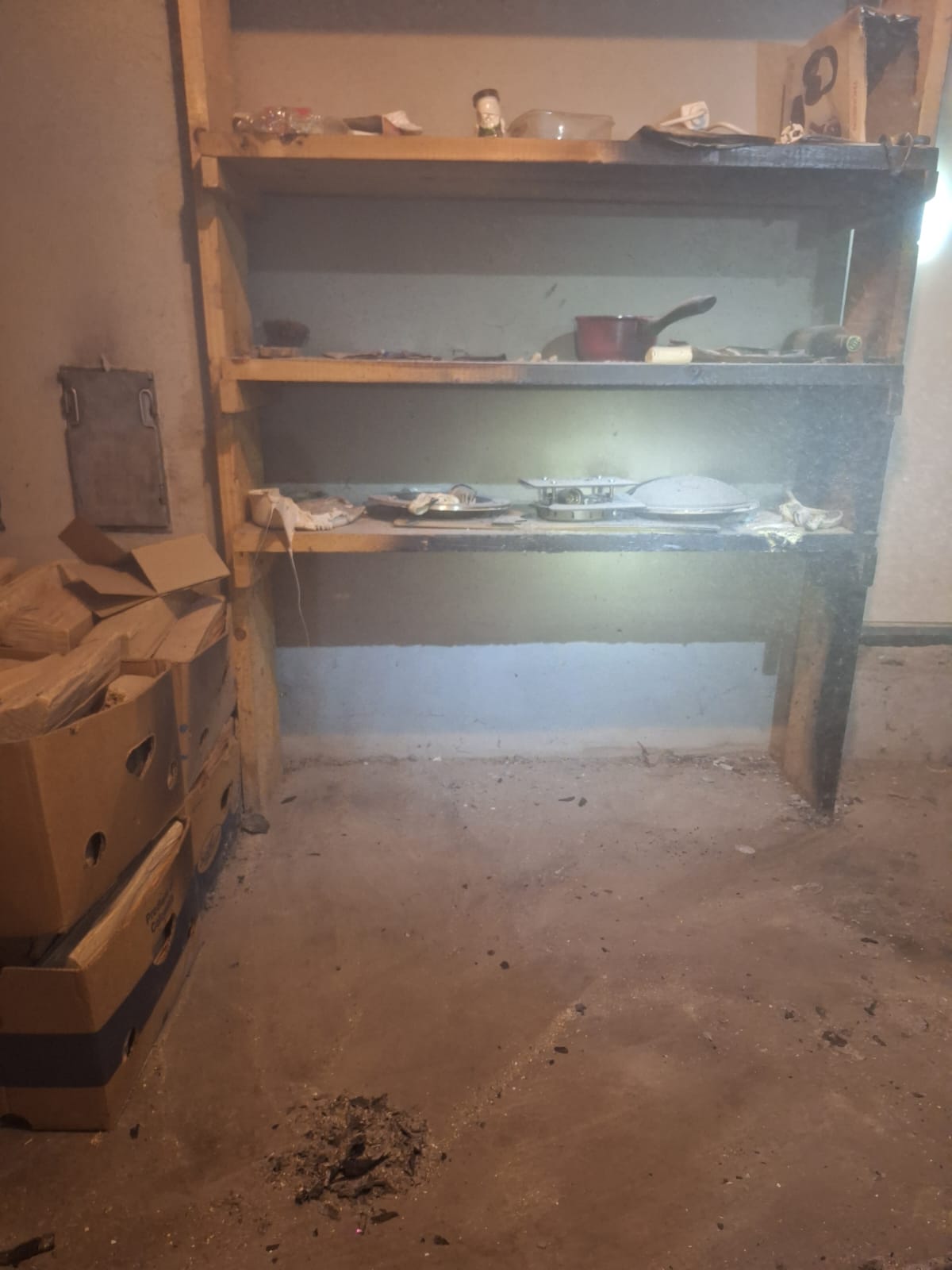 Mit Atemschutz Asche ins Freie gebracht. 2 Lüfter in Stellung gebracht.