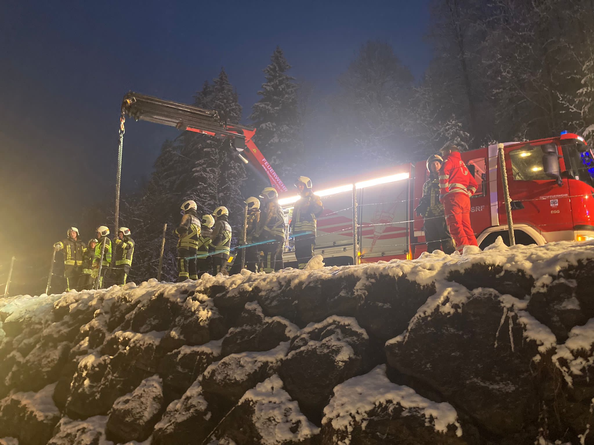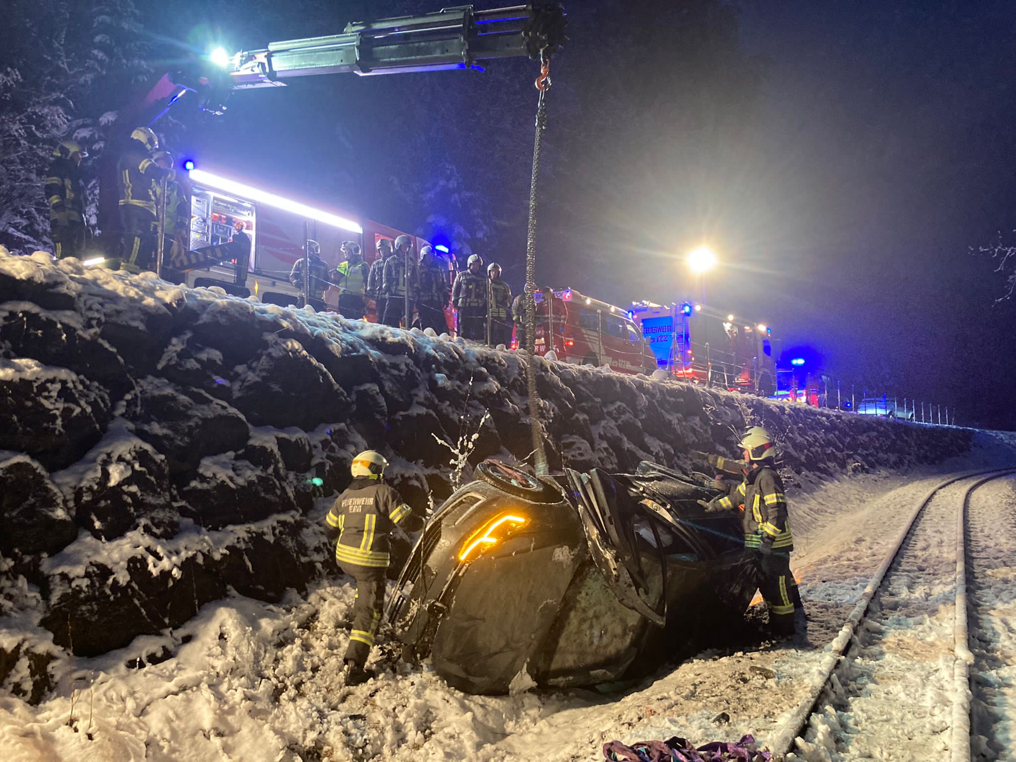 PKW auf Bahngleisen in Seitenlage. Mit SRF Kran Fahrzeugbegung, E-Auto in Zusammenarbeit mit der FW-Andelsbuch deaktiviert.