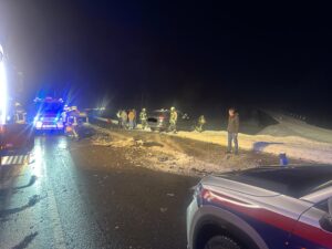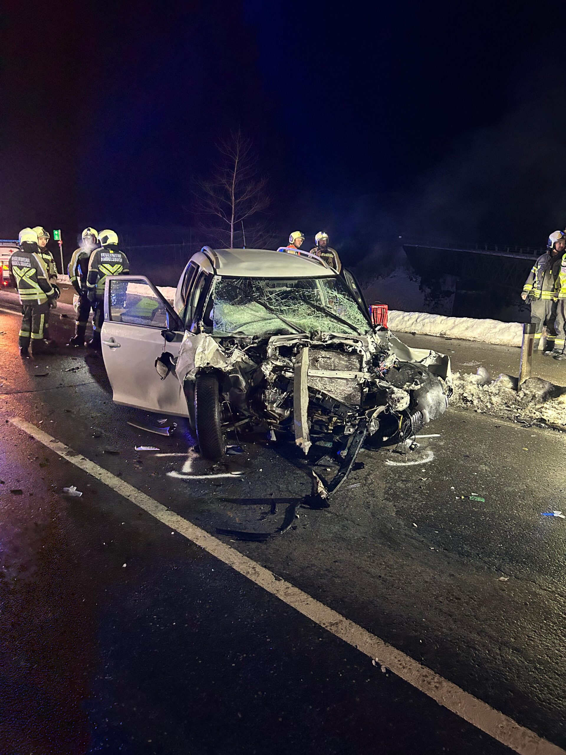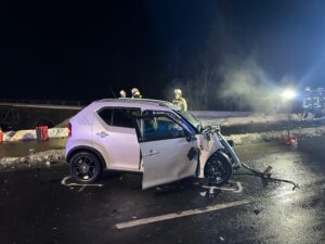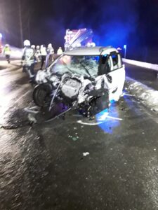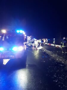 Mit Lichtmast Beleuchtung erstellt! Mit Bolzenschneider Türstopper durchtrennt, um die Türe weiter zu öffnen und mit Spineboard in Zusammenarbeit mit Rettung und Notarzt, Verletzte Person aus Fahrzeug geborgen!