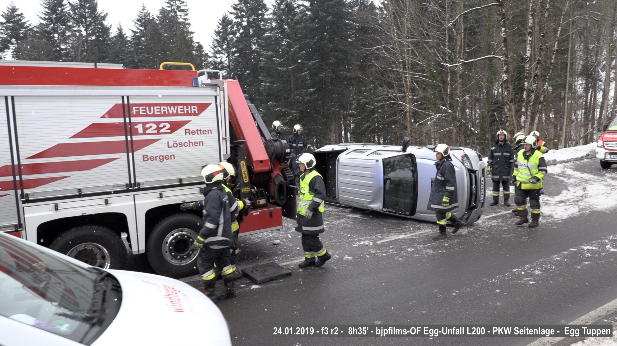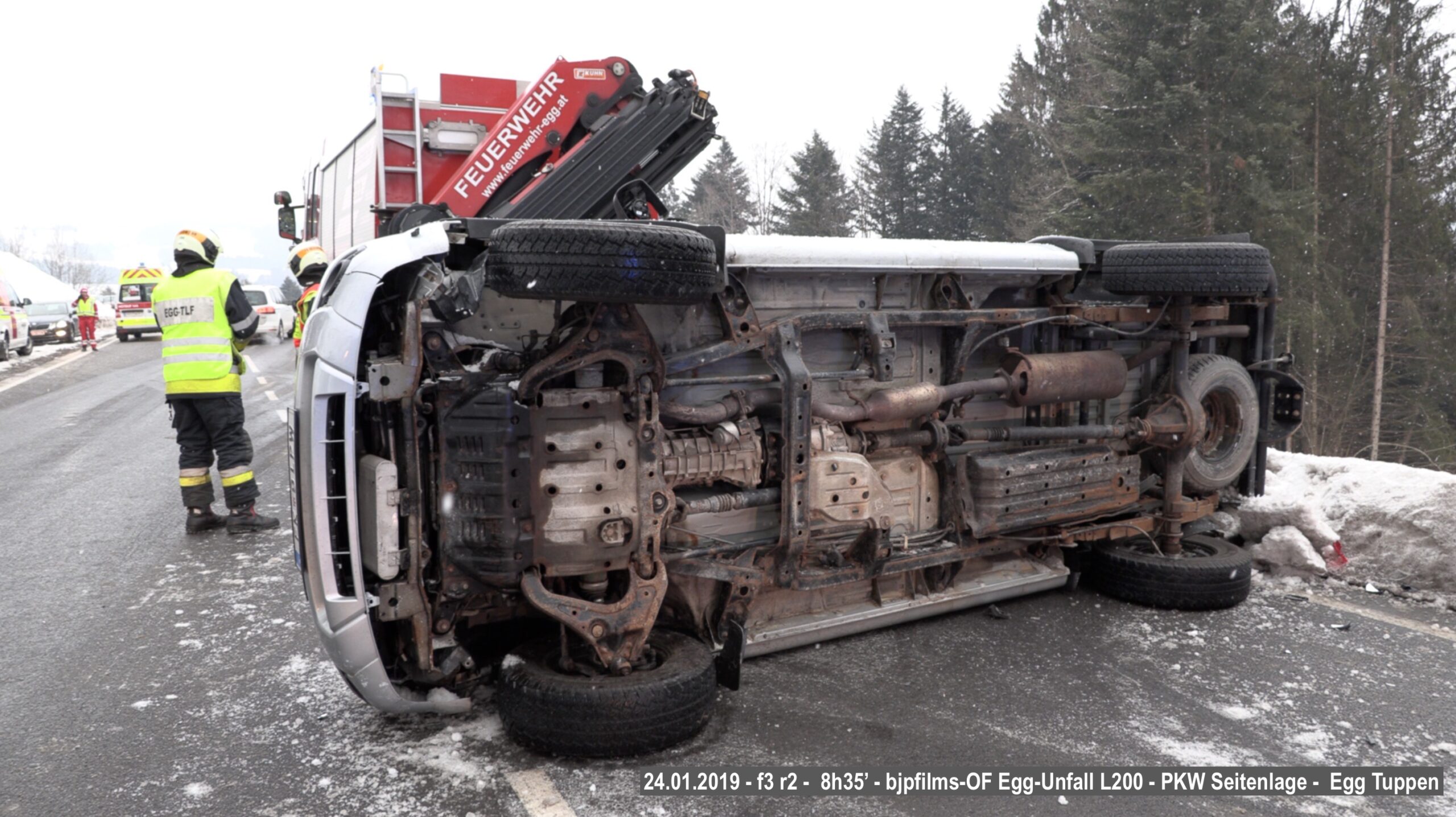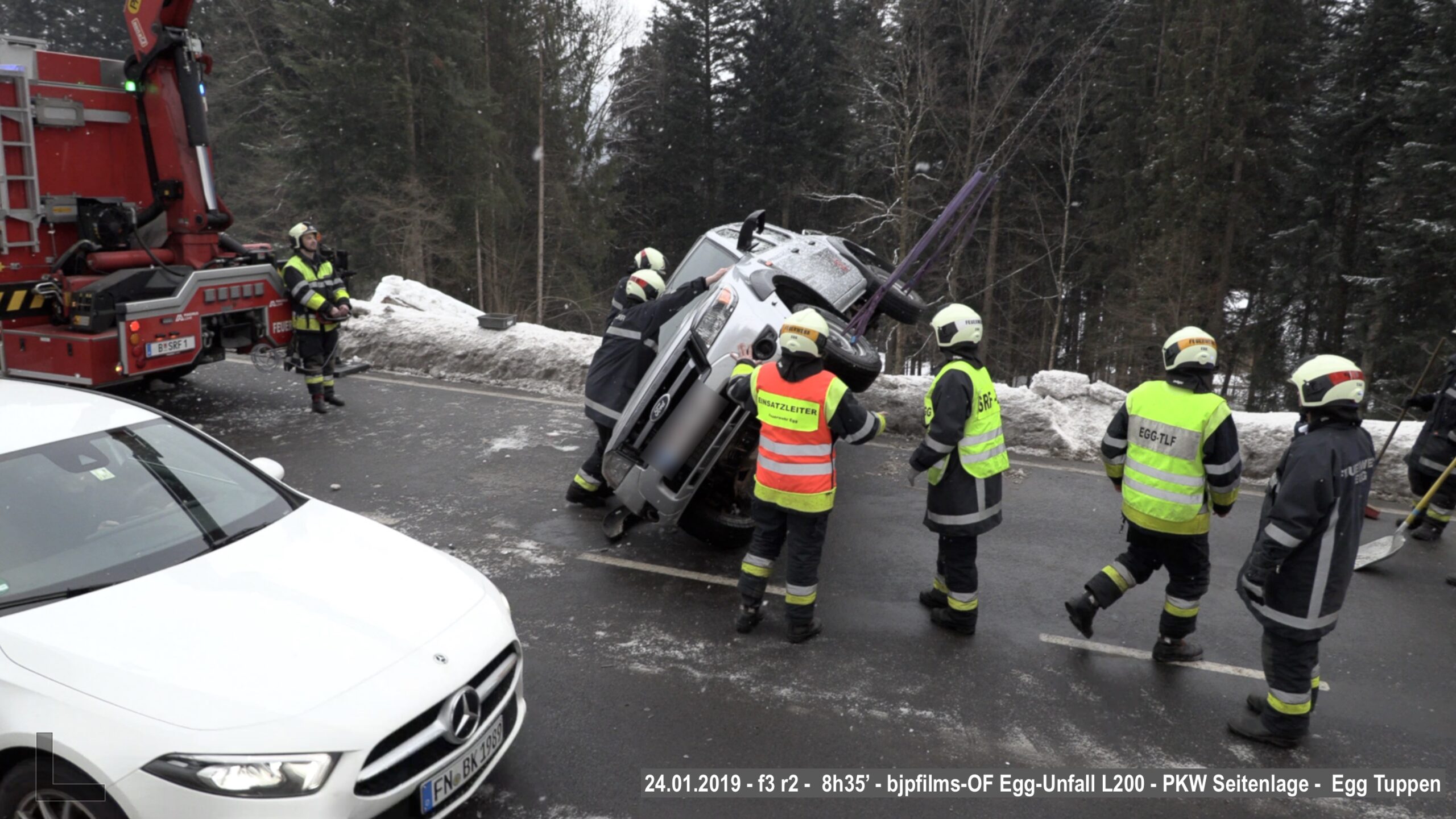 Verkehrsabsicherung L200, Brandschutz, Verkehrsreglung, mit Kran PKW auf Räder gestellt und auf einem Parkplatz abgestellt.
