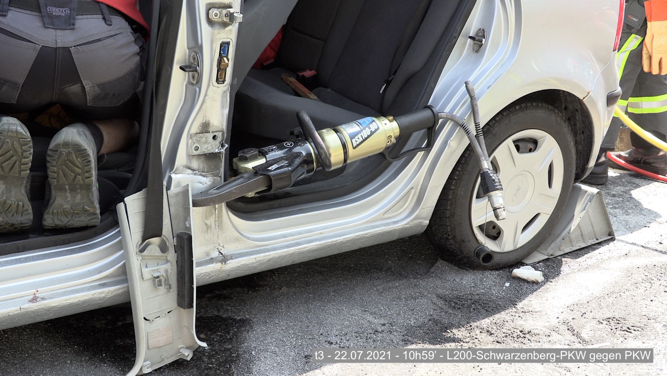 2 Personen im PKW nicht eingeklemmt, jedoch auf beiden Seiten mit Spreizer und Schere Platz machen für schonende Bergung. Spreizer und Schere von VRF und SRF plus Kombigerät im Einsatz. Sichtschutz aufgestellt. Bei der Bergung der Personen das RK unterstützt.
